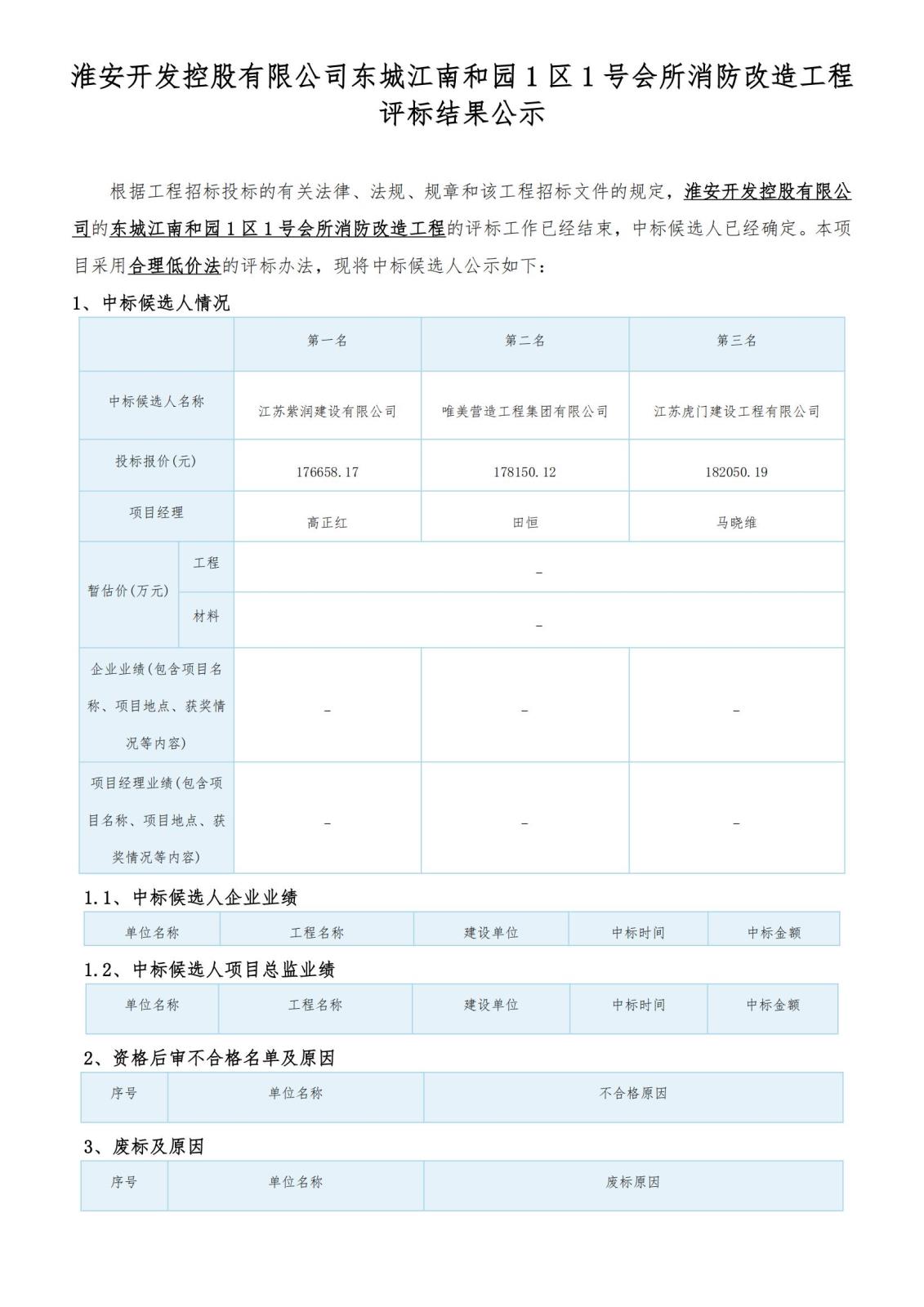 淮安開發(fā)控股有限公司東城江南和園1區(qū)1號會所消防改造工程 評標(biāo)結(jié)果公示